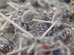 Vanilla cake pops enrobed in chocolate and rolled in red, white, and blue sprinkles. Wrapped individually with the “50” disc on the stick—ideal for kids, giveaways, and a perfect small indulgence.