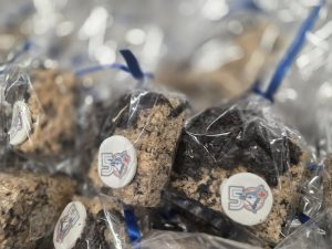 Crispy cereal bars bound with marshmallow, hand cut, drizzled with white chocolate, and dusted with cinnamon sugar. Topped with the commemorative “50” disc and tied with a blue ribbon.