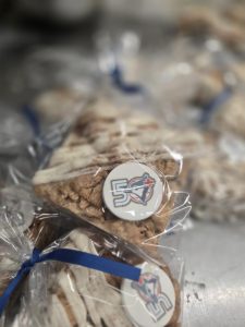 Our classic marshmallow krispie base loaded with crushed chocolate sandwich cookies, then crowned with more cookie crumble on top. Each bar gets the Blue Jays 50th logo and a blue bow—perfect for the cookies-and-cream fans in your crew.