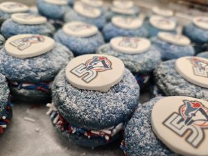 Soft, blue velvet cookies dusted with powdered sugar, sandwiched with fresh whipped buttercream and rolled in red, white, and blue sprinkles. Each one is crowned with an edible Blue Jays “50” disc. They’re cakey, creamy, and just fun enough to feel like a proper ballpark snack.