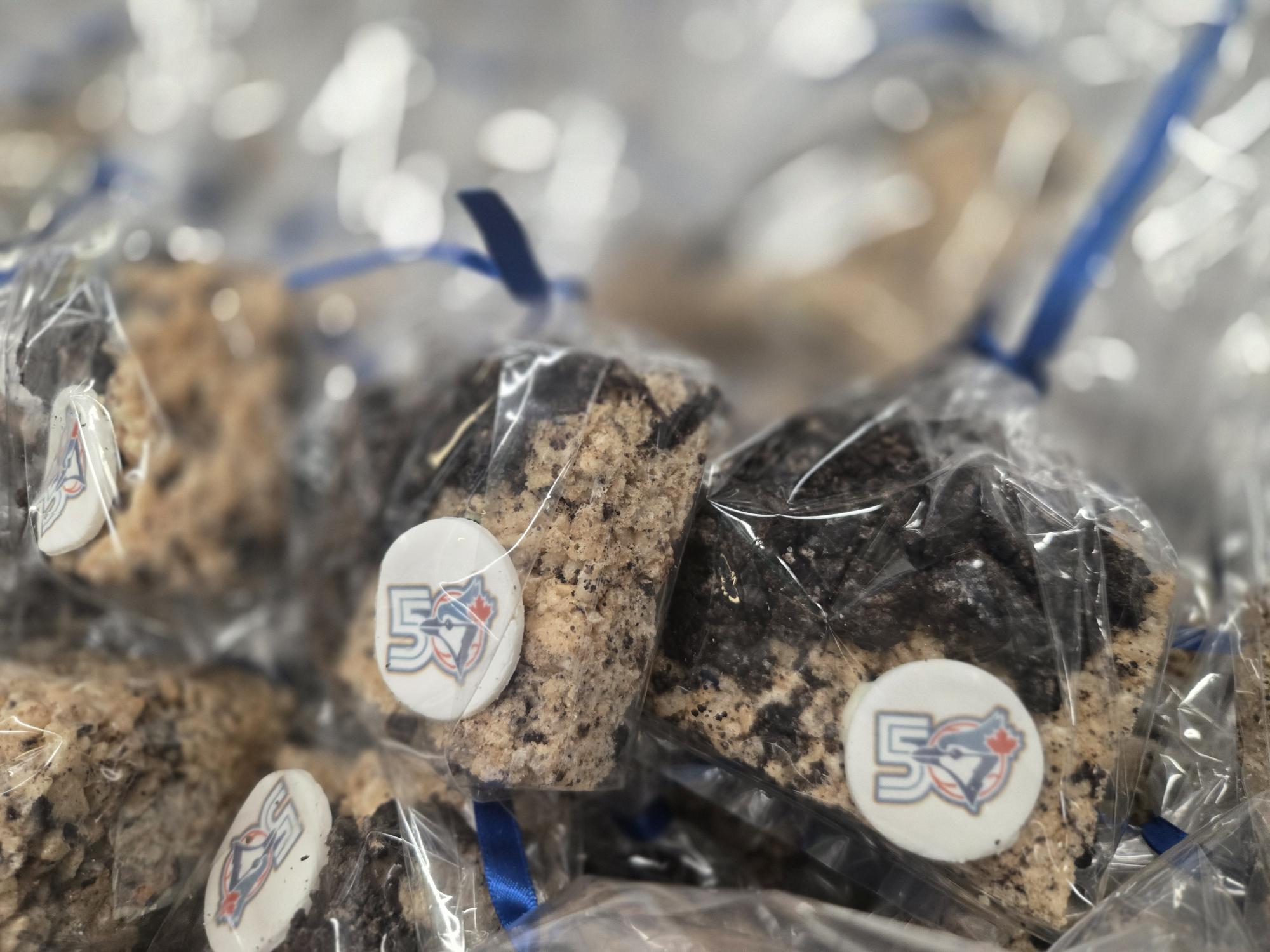 Our classic marshmallow krispie base loaded with crushed chocolate sandwich cookies, then crowned with more cookie crumble on top. Each bar gets the Blue Jays 50th logo and a blue bow—perfect for the cookies-and-cream fans in your crew.