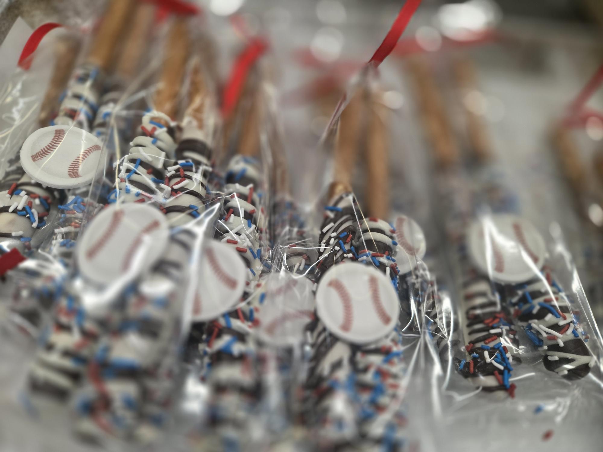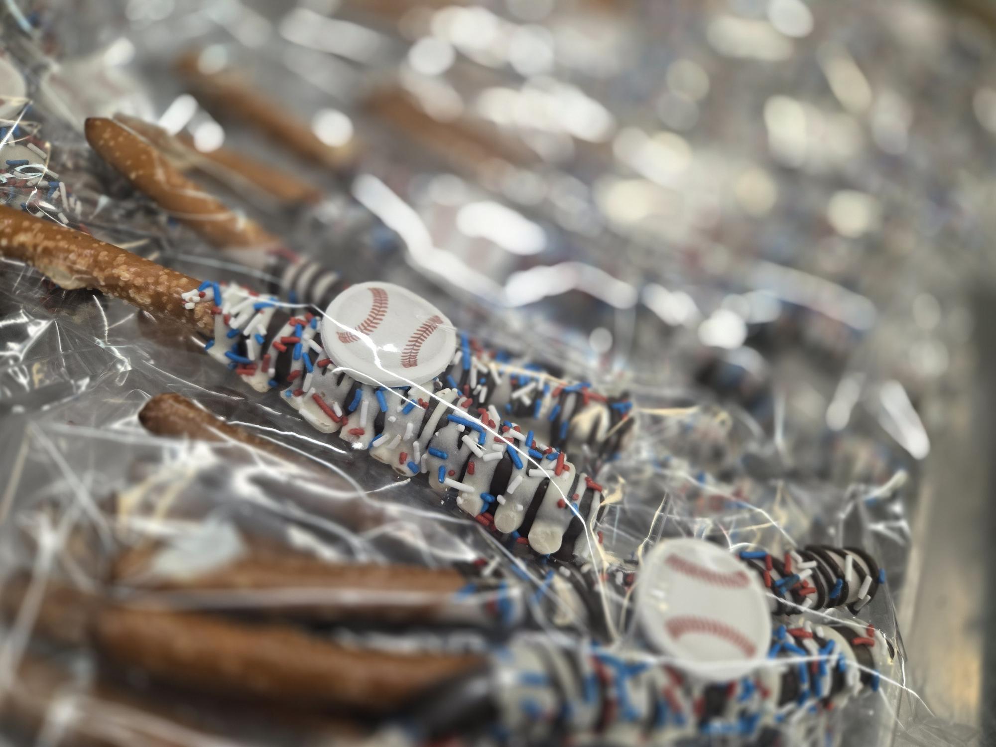 Salty pretzel rods dipped in dark and white Belgian chocolate, striped with drizzled chocolate, and finished with team-color sprinkles. A baseball fondant topper seals the deal. Sweet-salty crunch that travels well to the dome and home.