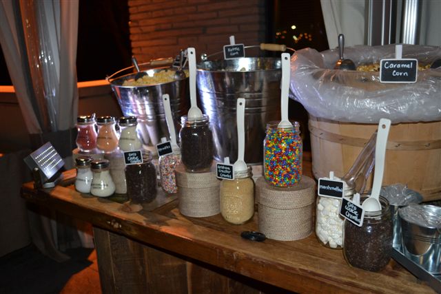 Take a look at our Gourmet Artisan Popcorn Bar- placed on top of wooden barrels, using a real vintage barn door….then for the food decor…. We popped fresh caramel corn- and butter and plain popcorn’s. Guests could then shake on their favourite seasonings- or add gourmet sweet toppings.